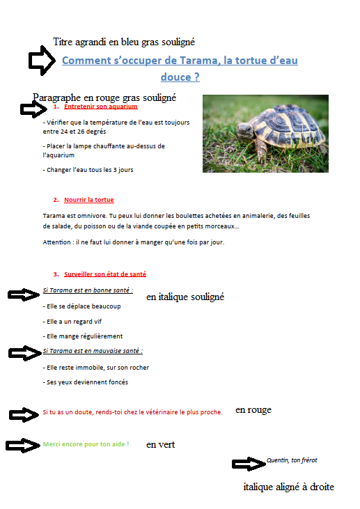 1 Copie colle le texte non formaté sur Libre office writer et mets-le en forme selon le modèle distribué. La photo se rajoute à la fin.